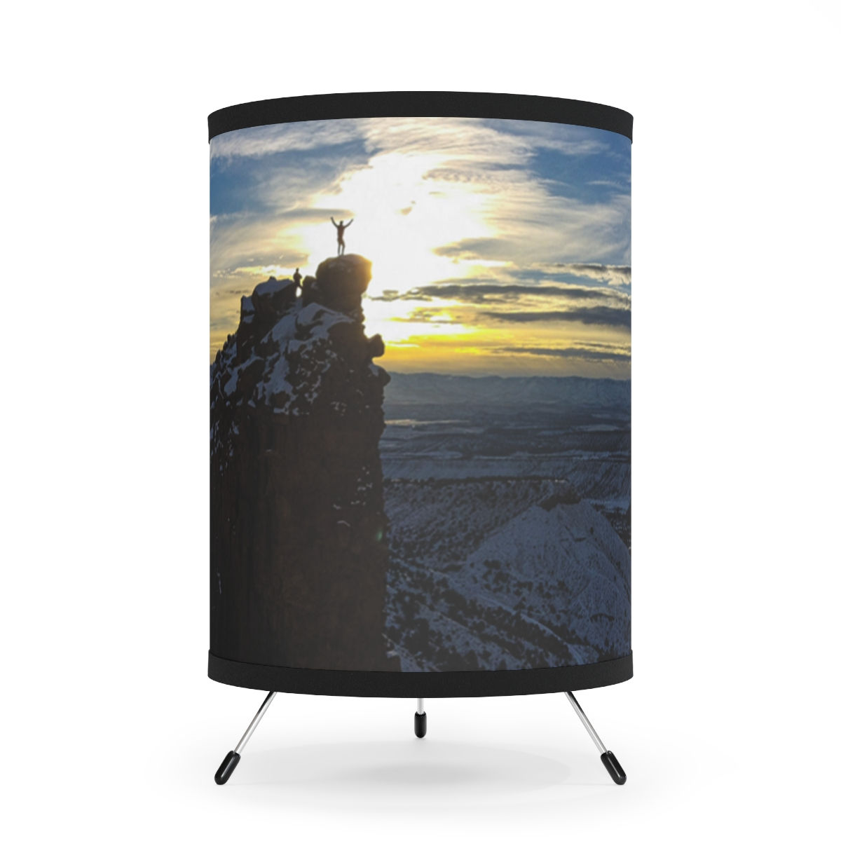An exclusive from The Collin Grant Collection. Using a photo taken by Collin Grant, a rock climbing, river rafting phenom, this lamp brings the joy of success into your room. Featuring a galvanized steel tripod base, this lamp delivers both high-end durability and a unique decorative touch. The lamp features a type A plug with two pins, which makes it suitable for the sockets used in the USA and Canada.